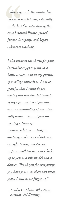 The Studio has a proven record of success in training dancers. Its graduates have continued on to careers with Ballet